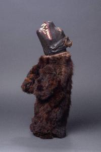 Testa di legno con sopracciglia e narici scolpite, bocca aperta contenente ventun denti di forme diverse (aguzzi, piatti e squadrati, piatti e scolpiti, in blocchi di quattro). L'interno della bocca comunica col foro per l'indice. Attorno alle orecchie sono inchiodate due strisce di pelo animale marrone scuro; la sinistra ha il pelo un po' consunto, la destra è tagliata in metà. Dipintura ad olio: colore nero, bocca (interno ed esterno) rosso scuro, denti bianchi. Occhi ricavati da borchie in ottone. Buratto di tela grezza, inchiodato al collo assieme ad una striscia di cuoio, bordato con fettuccia bianca all'apertura per le zampe. Al tessuto, nella parte terminale, è stato sovrapposto un inserto di velluto marrone (due strisce cucite insieme, per una larghezza complessiva di cm. 14), inserto che, all'imboccatura, è foderato di tela chiara. Il burattino è privo di abito e di zampe.