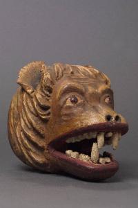 Testa di legno con pelo scolpito attorno al muso, bocca aperta contenente ventiquattro denti piatti e squadrati e tre canini molto appuntiti (un quarto, in basso a sinistra, è saltato), fronte corrugata, buchi alle narici, foro (cieco) in fondo alla bocca, per mortaretti. La metà inferiore della bocca è scolpita in un blocco a parte, fissato alla testa sotto la gola, e la giuntura è chiusa con una striscia di cuoio dipinto, inchiodata ad ambo le parti. Occhi ricavati da borchie in ottone. Ai lati della testa sono inchiodate due orecchie di cuoio. Dipintura ad olio: colore marrone con spennellature più chiare sulla punta del muso, sopra gli occhi e sugli intagli del pelo; la bocca (interno e labbra) e il retro della testa (piatto) sono rosso scuro, i denti bianchi.