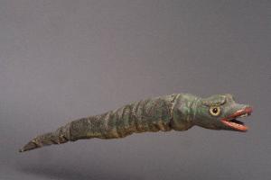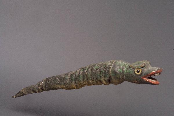 Testa di legno, di forma affusolata, con intagli longitudinali, narici bucate, bocca aperta contenente una quarantina di denti piccoli e squadrati. In fondo alla bocca è un foro cieco, per mortaretti. Occhi di vetro ricavati da spilloni. Dipintura ad olio: colore verde scuro, bocca rosso scuro, denti bianchi molto sporchi. Scrostature di colore e scalfitture alla sommità della testa e tra le due narici. Foro (di un tarlo) sulla sinistra. Corpo di tela grezza dipinta, avvolta attorno ad una molla e imbottita con stoppa, inchiodato alla testa e alla coda. Dipintura ad olio: colore verde scuro, con striature più chiare nella parte inferiore. La tela è molto impolverata. Coda di legno, di forma rozzamente conica, appuntita, identica alla testa per dipintura e colore; presenta una notevole scheggiatura sulla punta (non ridipinta). Nella parte inferiore della testa, all'attaccatura con la tela, è infissa la stecca (asta metallica lievemente curvata in cima, con impugnatura di legno tornito).