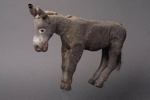 Testa e tronco di tela grezza dipinta, avvolta su una struttura di legno imbottito con stoppa. Dipintura ad olio: colore grigio, con una striscia più chiara intorno al muso (tra occhi e naso), bocca bianca e rossa. Occhi di vetro ricavati da spilloni. Ai lati della testa sono inchiodate le orecchie, di cuoio dipinto, ripiegato in doppio strato cucito insieme a punta. Sul collo è inchiodata una criniera di pelo animale piuttosto consunto, che parte in mezzo alle orecchie e termina sulla schiena; sotto questa criniera se ne intravvede una precedente, ancor più consunta. Posteriormente è inchiodata una coda di fibra vegetale, parzialmente rivestita di tela. Il colore si sgretola su quasi tutta la superficie della tela; inoltre la tela è tagliuzzata in vari punti. Zampe di legno inchiodate al tronco; dipintura ad olio, colore grigio con zoccoli neri. (continua in OSS)