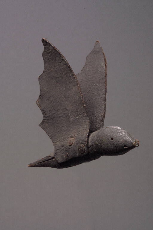 Corpo di legno, di forma affusolata; dipintura ad olio, colore nero. In punta è infisso un anellino (fil di ferro ripiegato) che serviva per legarvi o inserirvi direttamente oggetti. Il legno presenta una fenditura longitudinale verso la coda, su entrambi i lati, e numerosi buchi dovuti ai tarli. Ai lati, nel centro del corpo, sono inchiodate due ali rivolte verso l'alto, mobili, di cuoio dipinto in nero, frastagliate posteriormente. Inferiormente, al centro del corpo, è infissa l'asta, di fil di ferro, piuttosto flessibile, ripiegata ad anello all'estremita inferiore.