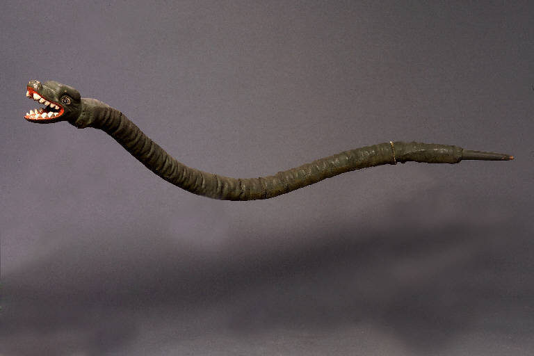 Testa e coda di legno, dipinte ad olio. La testa presenta una gibbosità sopra gli occhi e la bocca spalancata, con diciannove denti aguzzi scolpiti e un piccolo foro cieco, in fondo alla gola. Colore verde scuro bocca rossa, denti bianchi. Occhi di vetro ricavati da spilloni, scheggiati entrambi. Il colore presenta qualche scrostatura sulle parti più spigolose e molta polvere. La coda è appuntita, ha sezione circolare e il suo colore è identico alla testa (presenta scrostature in punta). Corpo di tela grezza dipinta, avvolta intorno ad una lunga molla, imbottita di stoppa e inchiodata a testa e coda. Dipintura ad olio; colore identico a testa e coda. La tela è tagliuzzata verticalmente in vari punti. Le stecche (aste metalliche con impugnatura di legno tornito), in numero di due, sono infisse inferiormente, la prima sotto la testa, in prossimità dell'attaccatura con il corpo e la seconda nella parte terminale del corpo.