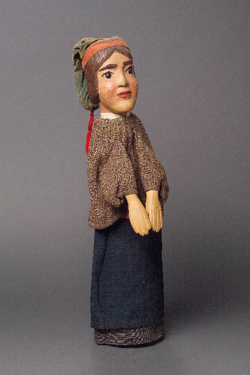 Berretto di velluto verde molto rovinato e con grande buco nella parte posteriore, bordato alla base con traversino rosso, con fiocco di lana rossa alla sommità e inchiodato alla testa in sei punti. Testa di legno dipinta ad olio: incarnato chiaro, capelli (scolpiti), sopracciglia. ciglia marroni, labbra rosse. Occhi di vetro ricavati da spilloni. Il colore è scrostato in più punti, sul viso. Colletto bianco, rigido, inchiodato. Giacca in tessuto di lana marrone, con fodera in tela stampata a quadri, fissata con sistema coulisse e un chiodo, bordata all'intorno e ai polsi con traversino marrone. Vestito bipartito: fascia superiore (camicia) di tela a righe longitudinali bianche e rosa; fascia inferiore di tela blu con fodera gialla e bordata con fettuccia nera. Il vestito è fissato con sistema coulisse. Buratto di tela scura stampata a righe orizzontali (nere sottili, grigie più larghe) e inchiodato al collo. Mani di legno dipinte ad olio e inchiodate al buratto.