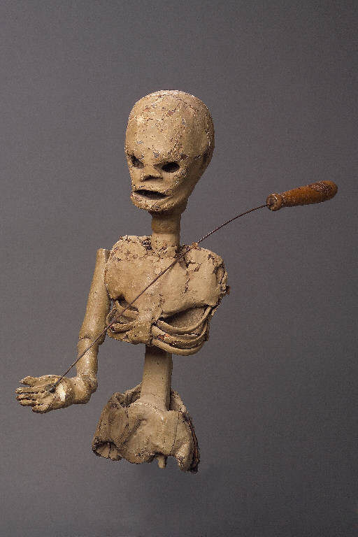 Testa di legno rivestita di tela e poi dipinta a olio, previa stuccatura. Scrostature di colore su tutta la superficie nonché fenditure nella materia. Il modellato anatomico è piuttosto approssimativo. Il collo dello scheletro è fissato all'asse longitudinale che funge da colonna vertebrale; ad essa è fissato il bastone (stecca di ferro a sezione quadrata) che parte dal collo del burattino e termina in basso con una manopola di legno che consente l'impugnatura. La cassa toracica è realizzata con più materiali: legno, cuoio, stoffa e carta incollati e sovrapposti tra loro, ovvero inchiodati insieme. Le costole sono realizzate in fibra di vimini opportunamente tagliata, stuccata, incollata e dipinta. La superficie è molto rovinata, il colore è scrostato nella parte posteriore e mancano addirittura pezzi della struttura sottostante. (continua in OSS)