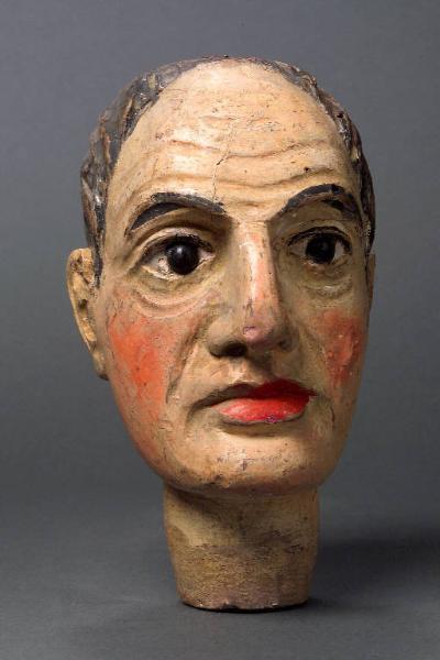 La testa è di dimensioni notevoli rispetto alla media dei soggetti presenti nella collezione. E' dipinta a olio: incarnato chiaro, labbra e guance rosse, occhi di vetro ricavati da spilloni, capelli scolpiti, sopracciglia e ciglia nere. Sulla sommità due fori corrispondenti ad altri due praticati nella base del collo (sistema in uso nell'attaccatura delle teste dei pupi). Un perno di ferro è piantato tra i due buchi della sommita e probabilmente attraversa tutta la testa per spuntare alla base del collo. Sono evidenti su tutto il viso grossi buchi provocati dai tarli; sulla fronte una fenditura attraversa le rughe. Il colore è consunto qua e là.