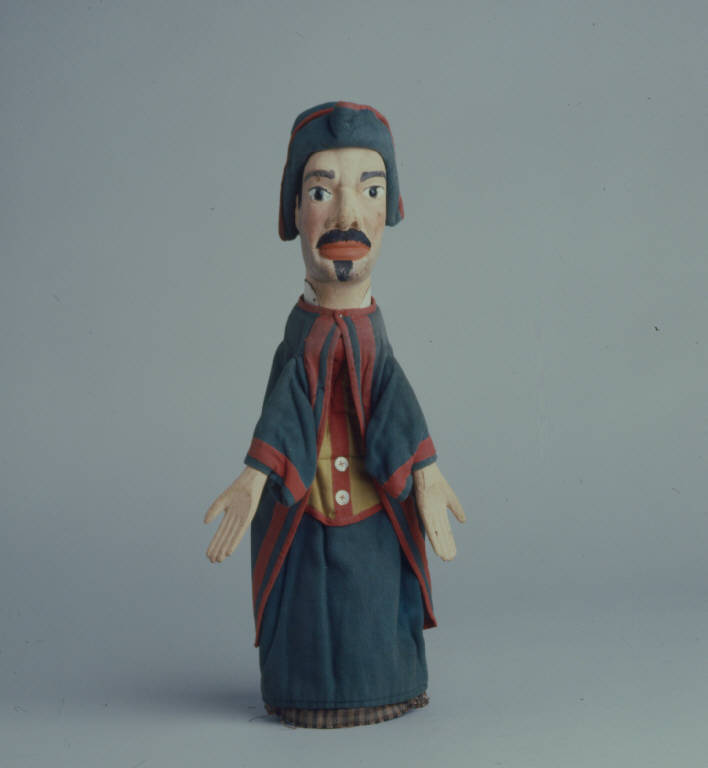 Tricorno di tela verde imbottita. La falda è internamente di tela rossa e bordata con traversino rosso. L'angolo anteriore della falda è fissato con un punto; il tricorno è inchiodato alla testa in tre punti. Testa di legno dipinta a olio: incarnato chiaro, guance rosee, ombreggiatura leggera della barba; labbra rosse; capelli, sopracciglia, (stinte), ciglia, baffi e pizzetto neri. Occhi di vetro ricavati da spilloni. Colletto bianco rigido inchiodato al collo. Lunga giacca di tela verde, foderata con tela grigia, terminante posteriormente a coda di rondine. Bordatura al collo e all'intorno (doppia) con traversino rosso come ai polsi. La giacca è inchiodata e fissata al collo con cordoncino. Gilet di tela gialla con fodera grigio antracite, bordato alle maniche e all'orlo con traversino rosso. (continua in OSS)