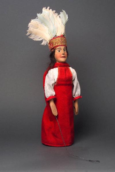 Capelli castani veri, inchiodati alla testa, lunghi fin sulle spalle cinti all'altezza della fronte, con nastrino rosso annodato posteriormente. Testa e corpo (lungo fino alla vita) di legno; al di sotto del corpo è infisso il bastone, pure di legno. Dipintura ad olio: incarnato chiaro, guance rosa, sopracciglia, ciglia e capelli (dipinti sotto la parrucca) neri, labbra rosse. Il colore è un po' impolverato. Il naso è stato riattaccato e presenta un foro dovuto ai tarli. Braccia di lana marrone melange, vuote, inchiodate alle spalle. Mani di legno inchiodate alle braccia, dipinte ad olio; la sinistra ha quattro dita. Nel palmo della destra è fissata un'asta di fil di ferro, ripiegata ad anello all'estremità inferiore, atta a muovere la mano. Il burattino è privo di abito.