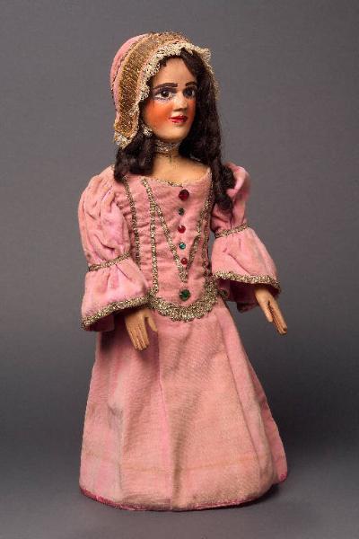 Capelli castani, veri, inchiodati alla testa, con boccoli lunghi fino alle spalle. Testa, corpo e bastone di legno. Bastone e gran parte del corpo (che termina ai fianchi) non sono dipinti. Dipintura ad olio: incarnato chiaro, guance rosa, capelli (dipinti sotto la parrucca), sopracciglia e ciglia (con palpebre dipinte) marroni, ombreggiatura intorno agli occhi, labbra rosse. Fenditura circolare intorno al collo (attaccatura della testa). Il bacino è scolpito in un pezzo a parte, fissato al resto del corpo con due ferri e una lamina metallica; presenta una fenditura sulla sinistra e inferiormente vi è fissato, in un incavo, un cuscinetto a sfere nel quale va inserito il bastone: in questo modo il burattino può ruotare sul suo asse. Braccia di stoffa vuota, inchiodate alle spalle, irrigidite con filo di ferro inchiodato alla schiena. Mani di legno inchiodate al buratto e dipinte ad olio, con colore un po' sporco. (continua in OSS)