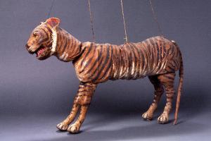Testa di cartapesta con rinforzi in legno. Occhi dipinti, bocca aperta che lascia vedere i denti. La parte anteriore e quella posteriore del corpo sono di legno e sono unite tra loro con una molla di metallo; il tutto è rivestito con tela preparata e dipinta ad olio. Zampe di legno con cuscinetti di tela imbottita, che impediscono il rumore eccessivo sul palcoscenico. Le zampe posteriori hanno la parte superiore imbottita e rivestita di tela. Le zampe sono articolate al corpo mediante perni in ferro. Colore scrostato qua e là.