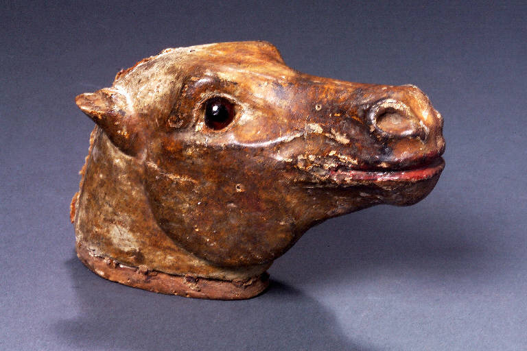 Testa di legno dipinta a olio di colore marrone; occhi di vetro marrone; labbra rosate. Orecchie intagliate: quella destra ha profonde scalfitture. Sul collo è inchiodata una sottile striscia di stoffa che in origine fungeva da supporto per la criniera. Alla base del collo una serie di chiodi, con qualche brandello di stoffa, delimitano la zona dove si raccordava il corpo. Il modellato è piuttosto accurato.