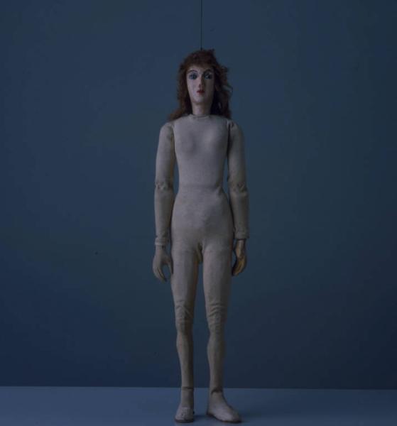 Capelli di stoppa biondo scuro, incollati e inchiodati alla testa. Testa di cartapesta dipinta ad olio. Incarnato chiaro, sopracciglia nere, ombreggiatura grigia intorno agli occhi, labbra rosse. Occhi azzurri, di vetro. Corpo di cartapesta con piedi, mani e braccia in legno. Collo, braccia, avambracci, mani, vita, gambe, ginocchia e caviglie snodati (ai polsi e alle ginocchia mediante strisce di cuoio). Il corpo è interamente rivestito da una tuta aderente di cotone beige. Ai piedi due scarpette bianche, di pelle, con suola di cartone, inchiodata. La mano destra presenta parecchi fori, dita consunte in punta ed è priva di pollice. Sulla sinistra, un fil di ferro ricurvo unisce le punte di pollice e indice, creando un anello entro cui inserire oggetti. La marionetta è priva di abito, di ferro e di fili.