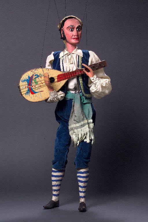 Berretto floscio di seta verde, cucito posteriormente ai capelli. Capelli di lana nera bouclé, inchiodati alla testa. Testa di legno dipinta ad olio. Occhi di vetro (forse di bambola) con pupilla marrone. Incarnato roseo, sopracciglia e ciglia nere, bocca rossa. Basette scolpite nel legno e dipinte di nero. Corpo snodato composto da tronco e bacino articolati insieme con striscia larga di tela. Braccia di stoffa inchiodate alle spalle, con la parte terminale (polso e mano) di legno. Gambe di legno articolate al ginocchio. Piedi di legno incastrati e incollati alla gamba. Camicia di seta bianca, cucita sul davanti. Fiocchetto di seta azzurra al collo, a mo' di cravatta. Maniche terminanti con polsino. Gilet di velluto blu sfoderato e decorato con nastrino verde al collo e all'intorno. Fascia di seta verde scuro in vita, annodata e cucita sul fianco sinistro. Decorazione e frangia di nastrino di raso verde acqua lavorato. (continua in OSS)