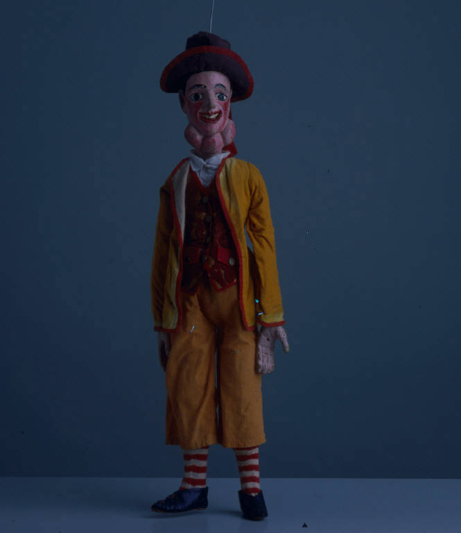 Cappello di cartoncino rivestito di tela marrone. La base della calotta è bordata con traversino rosso che si allunga posteriormente per terminare con due fiocchi rossi di cotone. Anche la falda è bordata di rosso. Il cappello è inchiodato alla testa. Testa di legno grossolanamente dipinta e poi verniciata. Capelli neri come sopracciglia e ciglia, bocca rossa, denti bianchi, profilati di nero, incarnato acceso, guance rosse come i tre gozzi (colore scrostato). Scrostature sulle arcate sopraccigliari e sul naso. La testa è articolata col corpo, che è di legno in un unico pezzo. Le gambe sono articolate col corpo e hanno l'articolazione al ginocchio. Le braccia sono di stoffa, imbottite di fibra (paglia?); ad esse sono inchiodate le mani, di legno, dipinte e con il colore molto scrostato. (continua in OSS)