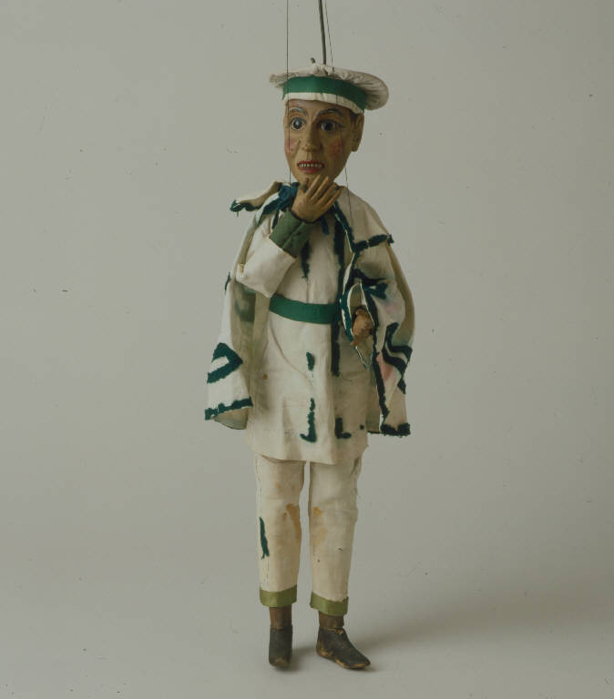 Cappello bianco, di tela rinforzata internamente con cartoncino, decorato alla base con striscia di fettuccia verde e inchiodato alla testa. Alla sommità è praticato un foro, ora molto allargato, per il passaggio del ferro. Testa di legno con bocca semiaperta e sei denti scolpiti. Alla sommità è infissa una cambretta per l'aggancio del ferro. Dipintura ad olio: incarnato piuttosto scuro, guance rosate, labbra rosse, denti bianchi, capelli marroni, occhi (dipinti), ciglia e sopracciglia neri. Il legno è alquanto tarlato su tutta la superficie e il colore presenta scrostature. La testa è articolata al corpo, che è di legno, in un unico blocco non articolato. Le braccia sono di stoffa, vuote, e all'estremità sono inchiodate le mani di legno, con unghie scolpite. (continua in OSS)