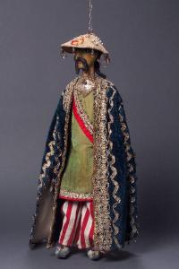 Testa di legno dipinta ad olio di colorito giallastro; Parrucca nera di capelli sintetici; sopracciglia e lunghi baffi neri intagliati; occhi profilati di nero; labbro inferiore arancio; presenta un foro tra le labbra. Il cappello spiovente è di cartone rivestito internamente di tela bianca, esternamente di seta color oro; è bordato intorno e lungo la cucitura posteriore con passamaneria laminata oro. Le decorazioni sono fatte con inserti di seta profilati con filo di lana azzurro e rosso e filo laminato; con grosse paillettes verdi e rosse contornate di paillettes più piccole fermate da corallini bianchi. Dalla falda del cappello pendono decorazioni di corallino di vetro e perle. Il cappello è inchiodato posteriormente con due sellerine. Il corpo è di legno, privo dell'articolazione del bacino; le mani sono di legno, con varie dipinture sovrapposte: la destra è molto mal ridotta e presenta un foro al centro. (continua in OSS)