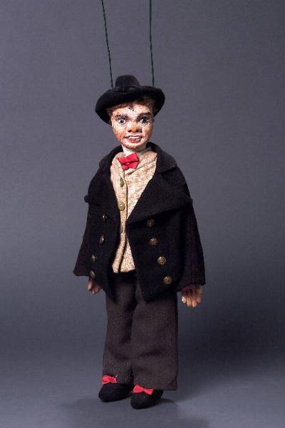 Cappello di feltro nero inchiodato alla testa, bordato con fettuccia nera alla base e sulla tesa. Alla sommità è praticato un taglio per consentire il passaggio del ferro. Capelli castani, di lana, inchiodati alla testa. Testa di legno finemente scolpita (con fronte corrugata e pieghe intorno agli occhi e sulle guance), bocca sorridente con qualche dente scolpito all'interno. La dipintura era ad olio ma il colore è quasi completamente scrostato: l'incarnato era roseo, le labbra sono rosse, come le cavità nasali, i denti bianchi, gli occhi (dipinti), le ciglia e le sopracciglia sono neri; probabilmente la faccia è stata scartavetrata e non ridipinta. Sulla nuca, sotto la parrucca, tracce di vernice nera. Il legno presenta numerosi fori dovuti ai tarli e una fenditura longitudinale in corrispondenza dell'orecchio sinistro. (continua in OSS)