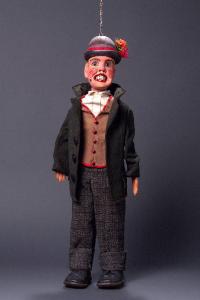 Testa scolpita originariamente per burattino, adattata a marionetta (articolazione nel collo). Nella parte superiore è stata aggiunta una bombetta, sempre in legno, stuccata e dipinta. La bombetta, dipinta in marrone scuro, è decorata con nastrino di fettuccia rossa, inchiodato all'intorno e con una rosa di plastica arancione con foglie verdi, fissata sulla sinistra. Alla sommità è infissa una cambretta per l'aggancio del ferro. Pieghe intagliate sulle guance e ai lati della bocca, che è aperta in un sorriso: gli angoli della bocca sono scavati all'interno e formano due fossette. All'interno sono visibili i denti scolpiti. Dipintura ad olio: incarnato roseo con guance più scure, labbra rosse (verniciate), denti bianchi profilati in marrone, spennellature lilla su guance, occhi e cavità auricolari, un neo marrone, capelli e sopracciglia marrone-verdastri. (continua in OSS)