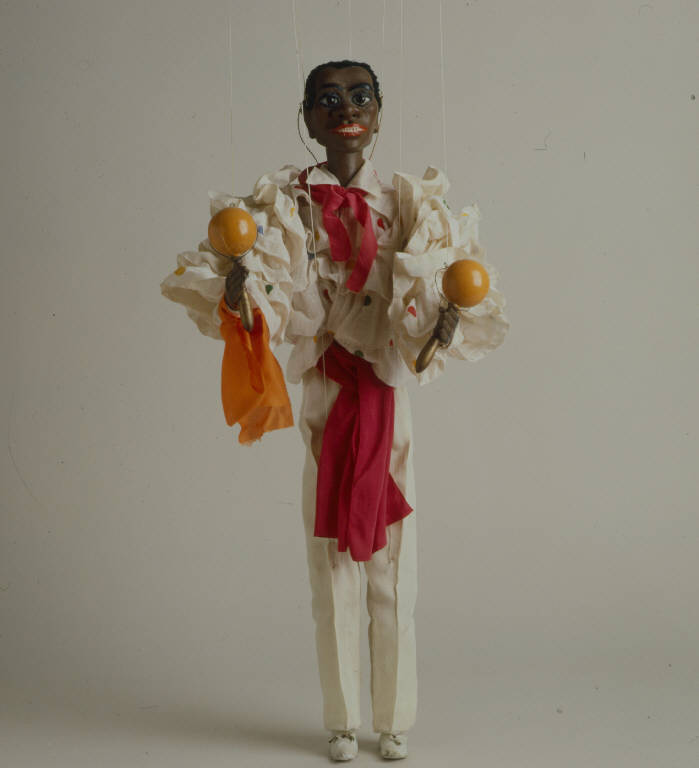 Testa di legno dipinta a olio, colorito bruno; sopracciglia e profilo degli occhi nero; occhi di vetro marroni; labbra rosse con denti dipinti; orecchie intagliate; parrucca di lana bouclé. Tronco e bacino di legno articolati mediante una fascia di tela inchiodata alle due parti. Braccia di stoffa imbottite; ad esse sono inchiodate le mani di legno dipinto. Alle mani sono fissate con fil di ferro, due piccole maracas di plastica con l'impugnatura dipinta color oro e la sfera arancione. Le gambe sono di legno provviste dell'articolazione al ginocchio. La camicia di tessuto bianco sintetico, ha sovrapposte numerose balze di tessuto bianco quadrettato e con pois rossi, gialli, blu e verdi. Al polso sinistro è legato un nastro di seta arancione; intorno al collo un foulard di seta rosa. Ampio colletto bianco. Pantaloni di seta bianca; fusciacca in vita di seta rosa. (continua in OSS)