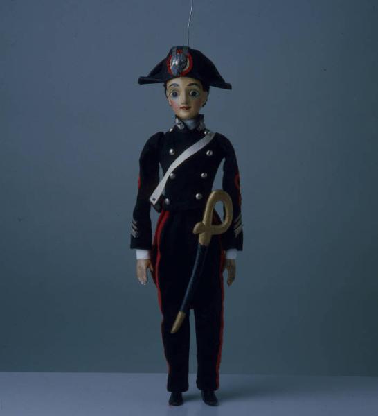 Testa di legno dipinta a olio, incarnato roseo, labbra e guance rosse. Sopracciglia, profilo degli occhi e occhi neri; ombreggiatura verde sotto gli occhi. Parrucca di tessuto bouclé nero, inchiodata su capelli dipinti di nero. Il cappello è di cartone dipinto di nero, bordato con traversino nero. Sulla falda anteriore ripiegata è fissata una coccarda tricolore (bianco, rosso e verde) ed un fregio metallico che imita la fiamma, simbolo dell'arma. Colletto bianco. Giubba di tessuto di lana nera con collo militare decorato con nastro laminato argento e due stellette metalliche. Il davanti è ornato con otto bottoni metallici di forma semisferica. Posteriormente la giubba termina a coda di rondine, bordata con flanella rossa e due fregi di nastro laminato argento alle punte. (continua in OSS)