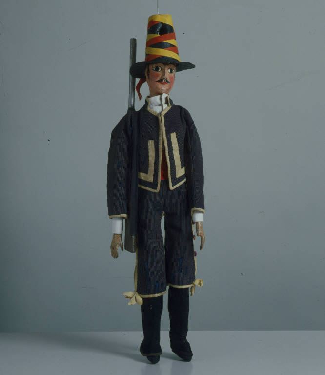 Testa di legno dipinta a olio, incarnato roseo, labbra rosse come le guance Capelli, baffi, sopracciglia, occhi e profilo degli occhi dipinti di nero. Alla testa è inchiodato in cappello di cartone dipinto di nero e ornato di traversino giallo e arancione. Corpo di legno, privo dell'articolazione del bacino. Braccia di stoffa imbottita, alle quali sono inchiodate le mani di legno, piuttosto piccole, con colore scrostato: alla mano sinistra manca il pollice. Gambe di legno con articolazione al ginocchio. Camicia di cotone bianco a pieghe; in vita una fascia di tessuto rosso sintetico. Giacca e pantaloni sono di tessuto di lana blu con sottilissime righine bianche e rosse. (continua in OSS)
