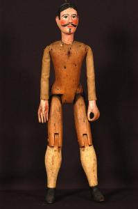 La marionetta si presenta priva di abiti, è interamente di legno salvo le braccia di stoffa. La testa è dipinta a olio, di incarnato chiaro con labbra e guance rosse. I capelli, le sopracciglia i baffi e il pizzetto sono dipinti di nero; i baffi sono sottilmente scolpiti, le orecchie sottilmente intagliate. Il busto è un unico pezzo di legno, non articolato in vita, alle spalle sono inchiodate le braccia di stoffa ed a queste le mani dipinte di rosa. La mano destra è aperta e presenta un foro al centro, la sinistra ha pollice e indice uniti a formare un cerchio, le altre tre dita sono spezzate. Le gambe sono unite al bacino mediante fil di ferro piuttosto spesso, l'articolazione del ginocchio è ottenuta mediante tassello di legno. I polpacci sono dipinti di bianco e i piedi, incastrati alle gambe con un altro tassellino di legno, sono dipinti di nero. Sulla schiena compare la scritta: "DISEEVIDO", forse Dsevodo, maschera di Parma.