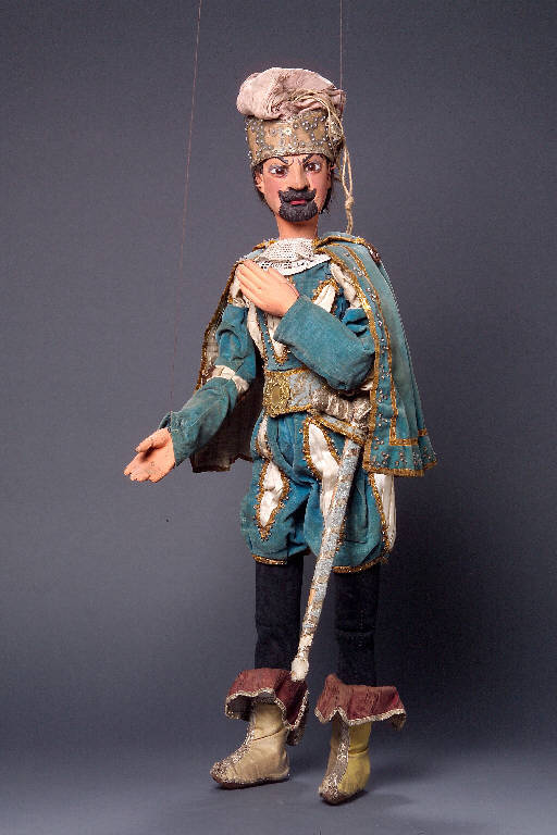 Testa di legno dipinta a olio, colorito roseo. Sopracciglia e profilo degli occhi nero; occhi di vetro marrone. Labbra rosse; baffi e pizzetto intagliati e dipinti di nero. Sui capelli dipinti è applicata una parrucca di capelli veri castani. Orecchie intagliate. All'altezza delle tempie sono inchiodate due cambrette per l'aggancio dei fili. Alla testa è inchiodato il cappello di seta rosa, con fascia semirigida di seta color oro, bordata con nastro laminato argento e paillettes metalliche fermate da corallini. Sul lato sinistro un fiocco di nastro laminato è fermato da un bottone circolare sfaccettato, color argento. Mantello di velluto azzurro con fodera bianca, bordato con nastro laminato oro e decorato con lo stesso nastro e con paillettes metalliche fermate da corallini. Il collo del mantello è dello stesso tessuto con decorazioni pendenti di corallini dorati. (continua in OSS)