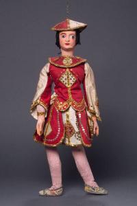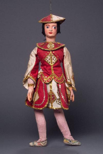 Testa di cartapesta dipinta a olio magro, colorito roseo; sopracciglia marrone; profilo degli occhi e occhi dipinti di nero, ombreggiatura violacea; labbra rosse. Parrucca di lana nera. Fascia rossa con nastrino laminato intorno alla testa. Cappello di cartoncino rivestito con stoffa rossa e bianca che forma degli spicchi delimitati da nastro laminato oro. Decorazione con paillettes dorate cucite negli spicchi. Il colore del viso è scrostato in più punti, sulle guance e sul mento. Il corpo è di legno, le braccia di stoffa rosa imbottita e bordata ai polsi con nastro laminato oro. Le mani sono di legno dipinto con foro nel palmo. Le gambe sono di legno, articolate al bacino e con lo snodo alle ginocchia ottenuto con elastico e lamiera sottile. I piedi sono articolati alle gambe e fissati con le punte rivolte verso l'esterno. (continua in OSS)