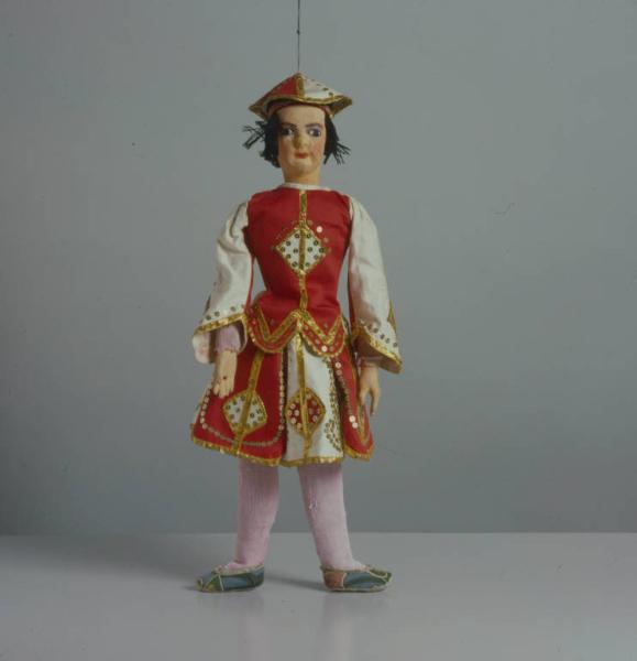 Testa di cartapesta dipinta a olio magro, colorito giallastro; sopracciglia marrone su nero, profilo degli occhi e occhi dipinti di nero, ombreggiatura violacea; labbra rosse. Colore scrostato su tutta la superficie del viso. Parrucca nera di lana, fascia rossa con nastrino di passamaneria argento intorno alla testa. Cappello di cartoncino rivestito con stoffa rossa e bianca che forma degli spicchi delimitati da nastro laminato oro. Decorazione con paillettes dorate cucite negli spicchi. Il corpo è di legno, le braccia di stoffa imbottita, ricoperta con maglina rosa. Le mani sono di legno dipinto con foro nel palmo nel quale è annodato dello spago. Le gambe sono di legno articolate al bacino e con lo snodo alle ginocchia: questo è ottenuto con elastico. I piedi sono articolati alle gambe e sono fissati con le punte rivolte verso l'esterno. (continua in OSS)