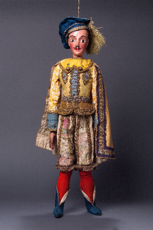 Testa di legno dipinta a olio, colorito roseo. Capelli, sopracciglia, ciglia e baffi dipinti marrone scuro. Alla testa è applicata una parrucca di capelli neri sintetici. Labbra rosse; orecchie intagliate. Cappello di seta blu, decorato con nastrino sottile di passamaneria argento e bordato con nastro laminato argento. Sul lato sinistro sono applicate piume di struzzo gialle, fissate con un fiocco di nastro argento. Collare di tessuto giallo, bordato al collo con nastro laminato oro, e all'orlo con passamaneria oro; la decorazione è completata da due paillettes metalliche e due bottoni ricoperti di stoffa laminata oro. Mantello di seta color oro, con fodera di tela bianca, decorato con doppia riga di nastro di seta viola e passamaneria argento. (continua in OSS)