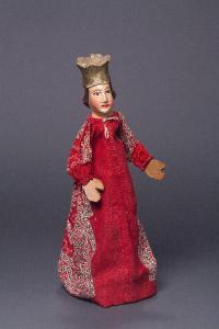 Testa di legno dipinta a tempera su preparazione a stucco e verniciata. Corona e capelli scolpiti. Incarnato chiaro, guance rosa, capelli e sopracciglia marroni, occhi grigi, labbra e cavità nasali rosse. La corona è dipinta d'oro su imprimitura verde. Scrostature di colore sul naso, alla base della corona e alla sommità. Buratto (che funge da vestito), fissato con sistema coulisse. Al collo gorgiera di tela rossa cucita al buratto. Polsi di tela rossa e fascia di tela rossa cucita in vita a mo' di cintura. Il buratto è di tela azzurra, ripiegata in due balze sotto la cintura, con bordo frastagliato. Mani di cartone cucite al buratto.