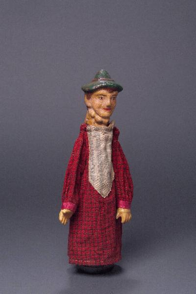 Testa di cartapesta macerata, ricoperta da uno spesso strato di stucco (o altro materiale) dipinto a tempera con leggera mano di mordente e verniciato. Cappello modellato, di colore verde con gala rossa. Incarnato bruno, capelli e sopracciglia marroni, labbra rosse, occhi marroni. Scrostature al mento. Buratto (che funge da vestito) fissato con sistema coulisse e con filo nero passante attraverso due fori praticati ai lati del collo. Il buratto è di flanella rossa a quadrettini profilati di nero; anteriormente inserto di flanella a righe bianche e grigie. Mani realizzate, con lo stesso materiale della testa, incollate alle maniche (la sinistra è incollata a rovescio). Sulla sinistra alcune dita sono prive di punta.