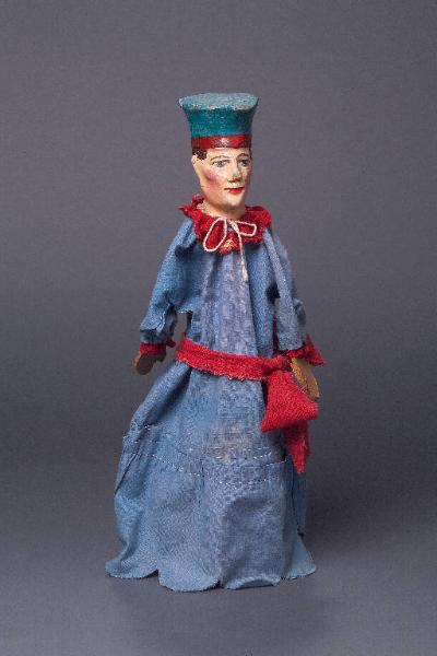Testa di legno dipinta a tempera su preparazione a stucco e verniciata, con cappello scolpito (più largo alla sommità che alla base). Incarnato chiaro, guance rosate, capelli, sopracciglia e ciglia marroni, occhi azzurri, labbra e cavità nasali rosse, cappello turchese con bordo rosso alla base. Screpolature del colore sparse sul volto, scalfitture su naso e orecchie. Buratto (che funge da vestito) di cotone rosso con disegni fantasia bianchi e neri (tranne che anteriormente, ai polsi e all'imboccatura, dove è completamente rosso), fissato al collo con sistema coulisse. Il tessuto è ripiegato in una balza all'altezza della vita. Mani di cartone cucite al buratto.