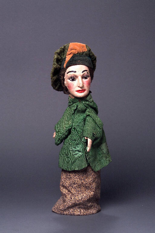 Cappello con calotta più larga della base, di velluto verde operato, con fregio anteriore di velluto marrone, inchiodato alla testa in tre punti. Testa di legno dipinta con colore a vernice satinata: incarnato chiaro, capelli, sopracciglia e ciglia neri, labbra rosse, guance rosa come le cavità nasali. Occhi di vetro. Sui capelli dipinti sono fissati dei capelli di fibra scura. Colore scrostato sull'arcata sopraccigliare sinistra, sul naso e sul mento. Giacca di cotone verde con fodera chiara, con collo e tasche di raso verde; posteriormente si apre a "V" capovolta. La giacca è inchiodata al collo, cucita sul davanti e chiusa anteriormente con due bottoni rivestiti di raso verde (un altro bottone al polso destro). Vestito di cotone beige stampato a motivo floreale blu, cucito all'orlo interno del buratto, che è di canapa stampata, con lettere dell'alfabeto e in rosso (probabilmente era parte di un sacco). II buratto è inchiodato al collo. (continua in OSS)
