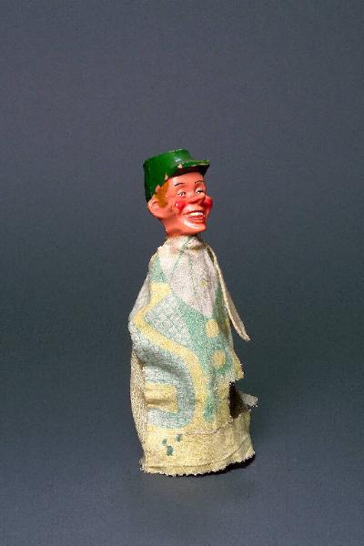 Testa e cappello di materiale plastico ottenuto su stampo. Incarnato roseo, capelli biondi, sopracciglia e ciglia nere, guance e labbra rosse, denti bianchi, occhi neri. Buratto (che funge da vestito) incollato al collo, di cotone stampato anteriormente che simula una giacca a quadrettini verdi con bavero verde e risvolti profilati di giallo; il cotone stampato simula anche il gilet verde con bottoni gialli e tasche gialle. Sul davanti c'è un vasto strappo e parte della stoffa è mancante. Macchie d'inchiostro sulla parte destra. Posteriormente il tessuto non è stampato, ed è di colore giallo. Le maniche non sono forate, quindi le mani del burattino sono le stesse dita dell'animatore nascoste nella stoffa.