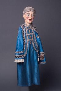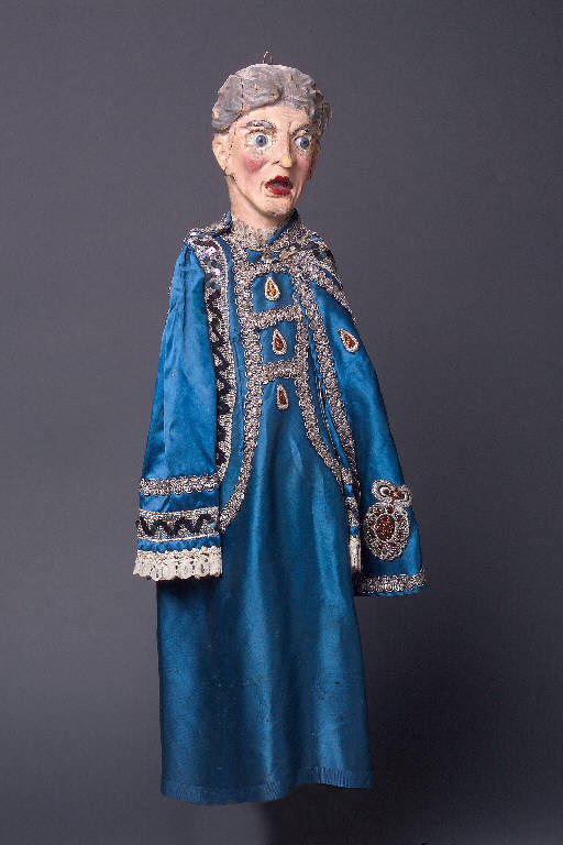 Testa di legno dipinta a olio magro, colorito chiaro, pennellature di rosa sulle guance. Occhi di vetro grigio-azzurri; sopracciglia e capelli grigi. Capelli e orecchie intagliati. Labbra rosse. L'espressione del viso è di sorpresa e spavento insieme. L'abito è di raso blu con decorazioni di passamaneria argento disposte in doppia fila, che partono dalle spalle e terminano posteriormente. Una fascia di passamaneria, la più esterna, ha un ricamo di paillettes blu disposte a serpentina. Sul petto sono cucite longitudinalmente tre gocce di tessuto laminato argento e oro. Al collo una ruche di pizzo bianco. Il mantello è di raso blu con fodera rosa, ha la stessa decorazione dell'abito ed ha cucite agli angoli due applicazioni di tessuto laminato argento e oro. Anche le maniche hanno la stessa decorazione e terminano al polso con del pizzo bianco. Il corpo del burattino è di legno massiccio, privo delle braccia. Il bastone è fissato nel busto e presenta innumerevoli buchi di tarlo.