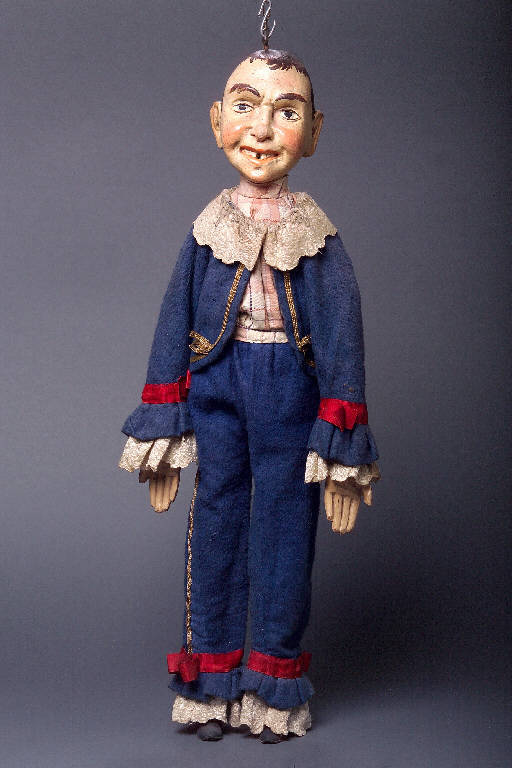 Testa di legno dipinta a olio, colorito roseo, labbra e guance arancio. Scrostature di colore sul naso; capelli, occhi e sopracciglia dipinte di marrone, le pupille nere. La bocca è socchiusa nel riso e mostra i denti intagliati e con un foro tra gli incisivi. Orecchie piuttosto grosse. La testa è inchiodata e cucita al corpo che è di stoffa imbottita; braccia e mani di legno. Il vestito è formato da pettorina della camicia di tessuto chiaro a quadri con righe verticali di fili rosa; la giacca è di panno blu bordata con passamaneria oro e con nastrino rosso alle maniche. Colletto e polsini di tessuto operato ecru. Pantaloni blu come la giacca con passamaneria oro lungo le gambe, nastrino rosso alle caviglie e bordo, cucito internamente, del tessuto di colletto e polsi. I piedi, intagliati come scarpe, sono di legno e dipinti di nero.
