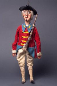 Testa di legno e cartapesta dipinta a olio magro e verniciata; colorito roseo. Sopracciglia, baffi e pizzetto dipinti marrone; labbra rosse; occhi e loro profilo dipinti di marrone. Parrucca di capelli sintetici bianchi raccolti in un codino fissato posteriormente. Tricorno di feltro nero bordato con nastrino nero. Corpo di legno; braccia di stoffa alle quali sono inchiodate le mani di legno dipinto. Gambe di legno, articolate al bacino e provviste di snodo alle ginocchia. Giubba di tessuto felpato rosso, con collo e fodera di tessuto felpato blu: la giacca ha gli angoli inferiori rivoltati e fissati sul fianco con una piccola borchia metallica. Polsi bianchi; colletto con decorazioni di nastrino giallo e due borchie metalliche. Sul davanti dei finti alamari di nastrino giallo e otto borchie metalliche quadrate. (continua in OSS)