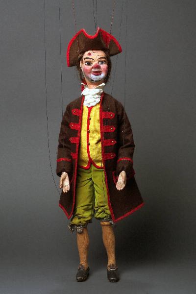Testa di legno dipinta a olio magro, colorito roseo, guance rosse; ombreggiatura della barba grigia. I bernoccoli sulla fronte e sulla guancia sinistra sono dipinti di rosso; labbra e naso rosso; sopracciglia e profilo degli occhi marrone; occhi di vetro marrone. Parrucca di capelli veri castani, raccolti posteriormente in un codino nel quale è inserito del fil di ferro ed e strettamente legato con del nastrino rosso. Il fil di ferro tiene l'estremità inferiore rivolta all'insù. Tricorno di cartoncino ricoperto di tessuto felpato marrone e bordato con nastrino rosso. La bocca è articolata e posteriormente è visibile il foro, mascherato, necessario al meccanismo. Il corpo è di legno; le braccia di stoffa alle quali sono inchiodate le mani di legno dipinto. Il dito pollice e indice della mano destra sono uniti a formare un cerchio; il dito pollice della mano sinistra è separato dalle altre dita con un chiodino. (continua in OSS)