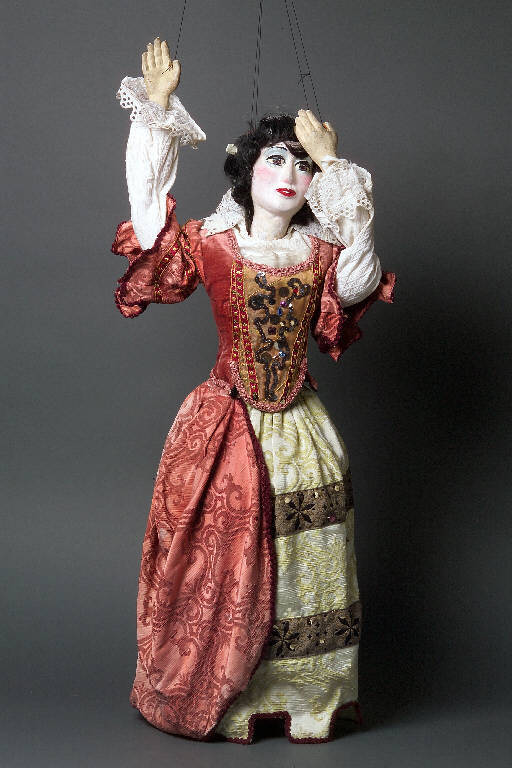 Testa di pasta di legno dipinta con colori acrilici, colorito chiaro. Sopracciglia, profilo degli occhi e occhi dipinti di nero; ombreggiatura grigia sulle palpebre. Labbra rosse. Parrucca di capelli sintetici neri sul quale è applicata un'acconciatura di cordoncino rosso intrecciato con nastrino sintetico bianco. Camicia di cotone bianco, operato a losanghe, con collo di pizzo bianco. Le maniche della camicia sono bordate ai polsi con traversino bianco e pizzo bianco. Il corpetto è di velluto rosa antico con una pettorina di tessuto riccamente decorato con paillettes grigie, paillettes più grandi dorate e pietre colorate (rosa, azzurro e oro). Questa decorazione è bordata con nastrino di passamaneria rosso con ricami floreali gialli e verdi. Tutto il corpetto è bordato con passamaneria rosa antico e sulla scollatura sono applicate internamente tre strisce di voile in sovrapposizione. (continua in OSS)
