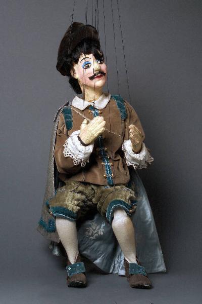 Testa in pasta di legno dipinta con colori acrilici, colorito chiaro; sopracciglia, profilo degli occhi e occhi dipinti di nero. Sugli occhi è applicata della vernice trasparente lucida. Ombreggiatura azzurra sulle palpebre. Labbra rosse. Parrucca di capelli sintetici neri, usata anche per i baffi. Cappello di velluto marrone con falda rivoltata, bordato con passamaneria nera e decorato con coccarda di velluto azzurro e piuma gialla sul lato sinistro. La giacca è di velluto marrone chiusa da bottoni automatici mascherati da una finta abbottonatura formata da passamaneria azzurra, cordoncino azzurro e quattordici bottoncini metallici dorati legata insieme con il cordoncino. Due spalline di velluto azzurro sono applicate all'attaccatura delle maniche. Collo di cotone bianco chiuso da un bottoncino. Le maniche sono bordate ai polsi con pizzo bianco. (continua in OSS)