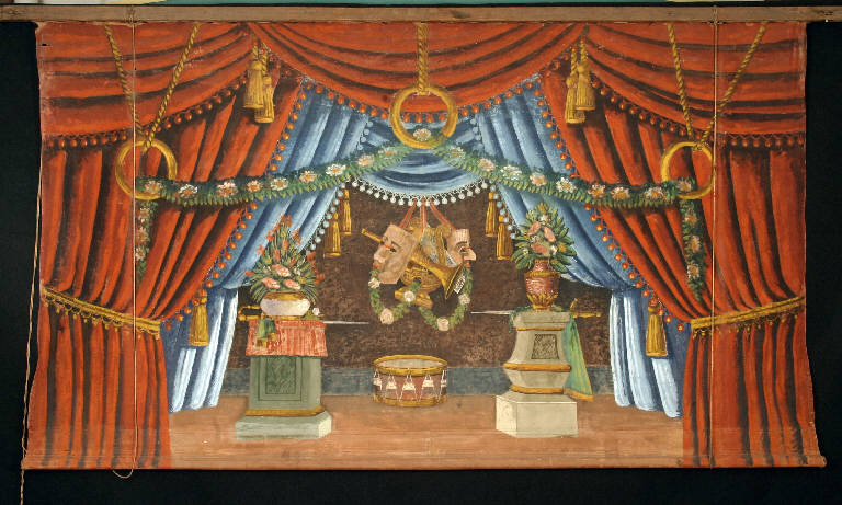 Il sipario è inchiodato ad una cantinella alla quale sono fissati degli anelli di vetro nei quali passa una corda robusta che, adeguatamente collegata con la stoffa del sipario, provvede a farlo salire e ridiscendere alla bisogna. Nella stoffa, in basso, c'è una cucitura che consente ad un bastone di legno di fare da contrappeso al sipario.