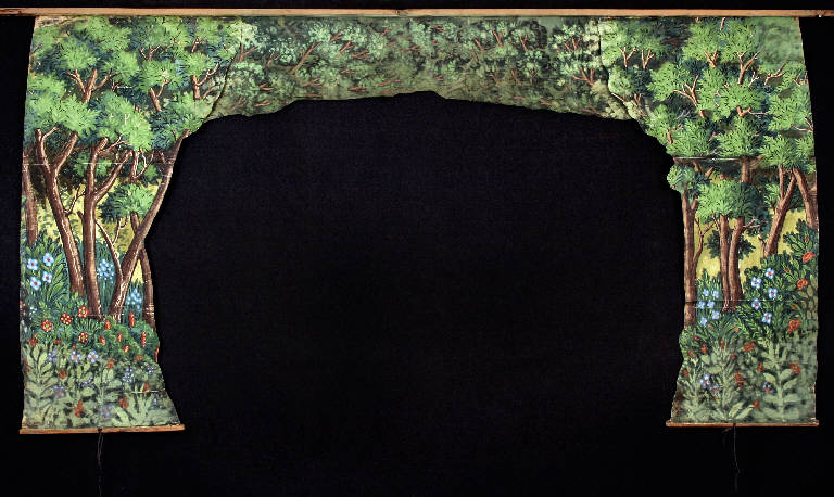 - NOTIZIE STORICO CRITICHE Utilizzato per la rappresentazione di "Guerrin Meschino". I materiali Preti di questa Collezione provengono dall'edifizio di Carlo Preti al quale si sono aggiunti nei primi anni del '900 quelli del fratello Guglielmo quando questi decide di ritirarsi dal lavoro. A questi si aggiungono quelli prodotti da Ermenegildo Preti e dai suoi numerosi figli (Rosa, Nando, Dario, Maria). Salvo indicazioni diverse nelle schede, è difficile risalire all'autore anche perchè il nucleo è stilisticamente omogeneo sia per quanto riguarda i burattini sia per le scenografie.