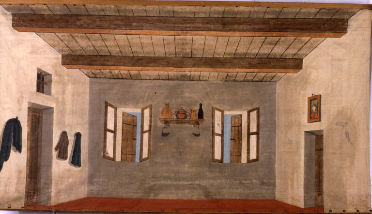 - NOTIZIE STORICO CRITICHE Utilizzato per la rappresentazione di "Sandrone". I materiali Preti di questa Collezione provengono dall'edifizio di Carlo Preti al quale si sono aggiunti nei primi anni del '900 quelli del fratello Guglielmo quando questi decide di ritirarsi dal lavoro. A questi si aggiungono quelli prodotti da Ermenegildo Preti e dai suoi numerosi figli (Rosa, Nando, Dario, Maria). Salvo indicazioni diverse nelle schede, è difficile risalire all'autore anche perchè il nucleo è stilisticamente omogeneo sia per quanto riguarda i burattini sia per le scenografie.