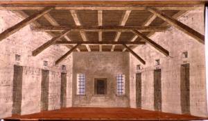 Il fondale è inchiodato ad un bastone di sezione circolare o quadrangolare mediante chiodi e pezzetti di cuoio salvatela. Sul retro è dipinta la sala di un castello.