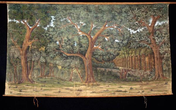 Il fondale è inchiodato ad un bastone di sezione circolare o quadrangolare mediante chiodi e pezzetti di cuoio salvatela. Sul retro è dipinto una piazza.