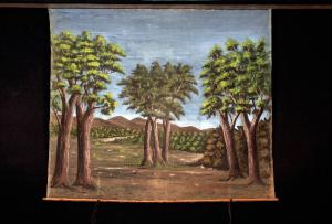 Il fondale è inchiodato ad un bastone di sezione circolare o quadrangolare mediante chiodi e pezzetti di cuoio salvatela. Sul retro è dipinto un cortile.