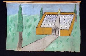 Il fondale è inchiodato ad un bastone di sezione circolare o quadrangolare mediante chiodi. Sul bordo superiore è presente un'armatura di garza. Il bordo inferiore è frastagliato.