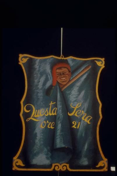 La plancia veniva posta fuori dalla baracca per attirare gli spettatori. La tavola è di masonite dipinta a tempera e sagomata con cornice gialla attorno. Alla sommità è inchiodato un gancio rotondo che consentiva di appendere la plancia. E' presente una scritta gialla.