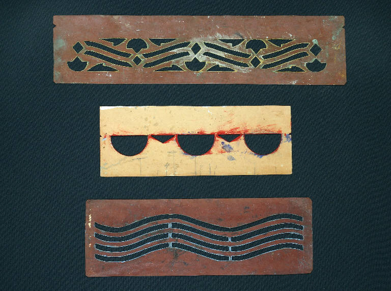 I cartoni per trasposizione, realizzati in cartoncino disegnato e ritagliato secondo un motivo decorativo, venivano utilizzati per creare decorazioni all'interno delle scenografie, consentendo di riprodurre in serie il motivo ornamentale. La prima mascherina presenta una complessa greca di ornato con vari elementi geometrici intrecciati, la seconda presenta dei semicerchi alternati a piccoli triangoli, la terza ha segmenti posti paralleli l'uno all'altro a formare, nel complesso, un'onda.