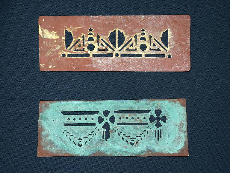 I cartoni per trasposizione, realizzati in cartoncino disegnato e ritagliato secondo un motivo decorativo, venivano utilizzati per creare decorazioni all'interno delle scenografie, consentendo di riprodurre in serie il motivo ornamentale. La prima mascherina presenta un festone composto da vari elementi prevalentemente geometrici, la seconda presenta due coccarde collegate tra loro da un nastro di piccoli elementi a foglia e da una fascia superiore.